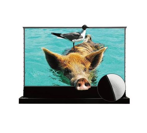 Напольный, корпусный, выезжающий вверх ALR-экран для УКФ-проекции: 120" (16:9) 266 x 149 см, ALR-полотно (коэф-т усилиения 0.6) с боковым петлевым натяжением совместимо с разрешениями до 8K, обзор 170°, тихий мотор, корпус чёрный ШхВхГ (с учётом вывода кабьеля питания слева) 291 х 12 х 16 см, вращающиеся ушки для фиксации к полу, настраиваемое нижнее чёрное поле до 23 см. Общая высота при открытом экране 188 см, вес 32 кг, беспроводной пульт (РЧ/ИК) в комплекте.