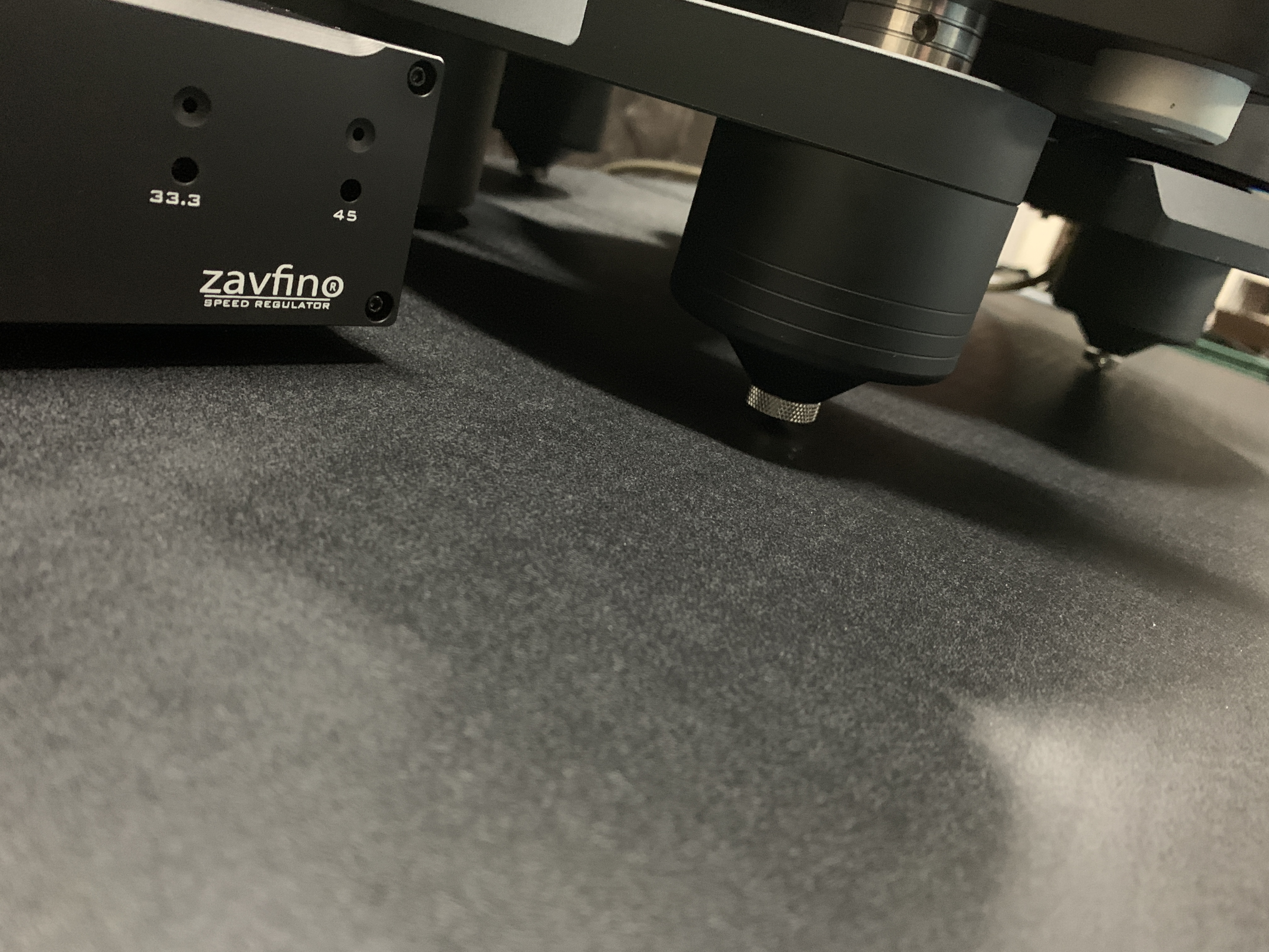 В стандартную комплектацию проигрывателя Zavfino ZV8 включен полностью независимый источник питания двигателя в алюминиевом корпусе весом 2 кг. Источник питания мотора имеет цепь регенерации переменного тока переменный - постоянный - переменный, что обеспечивает мотор переменным током с идеальной синусоидой. Переключение скоростей 33,3 и 45 об/мин. Тонкая регулировка выбранной скорости.