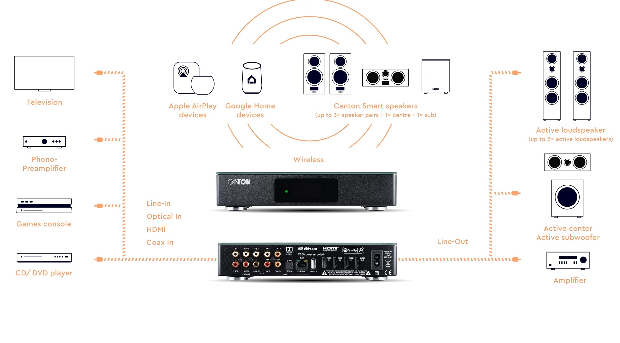 Высококачественный предварительный усилитель AV служит центром подключения и интерфейсом для ваших интеллектуальных динамиков и усилителей мощности. Передача без потерь с высоким разрешением до 24 бит / 96 кГц обеспечивает основу для впечатляющего звучания. Таким образом, вы можете передавать по беспроводной сети до 8 интеллектуальных динамиков и по кабелю на еще 6 активных динамиков или усилителей мощности. Многомерный виртуализатор обеспечивает потрясающий объемный трехмерный звук - даже в стереорежиме. Будь то потоковое стерео или проводное соединение через тюльпан, подключенное как домашний кинотеатр или как интерфейс для подключения вашего усилителя к WLAN - возможности универсальны и уникальны.