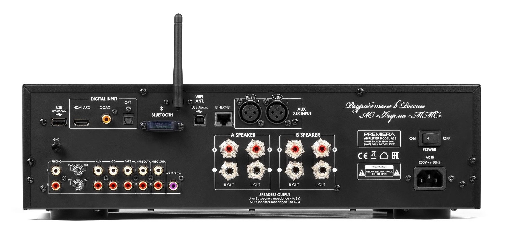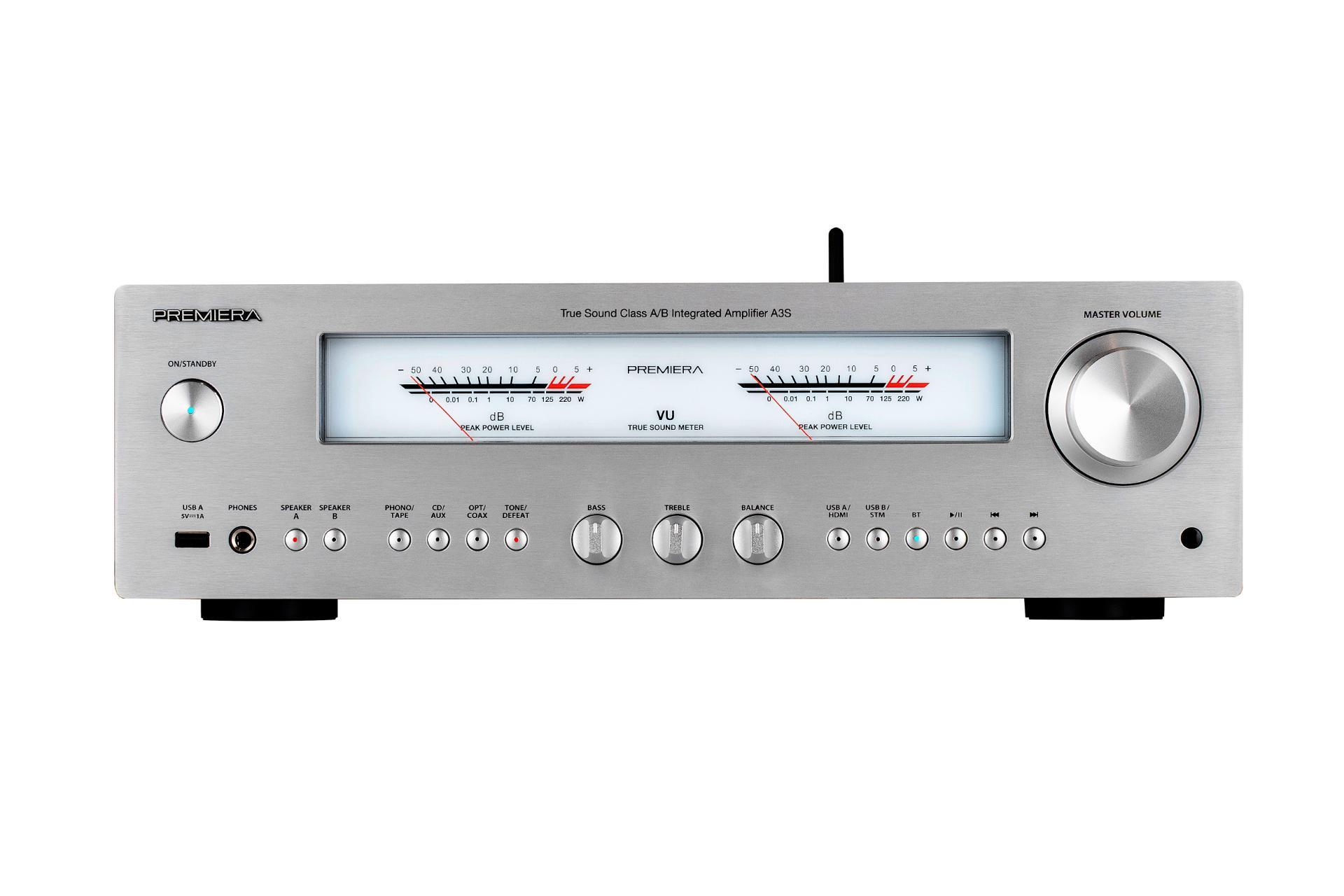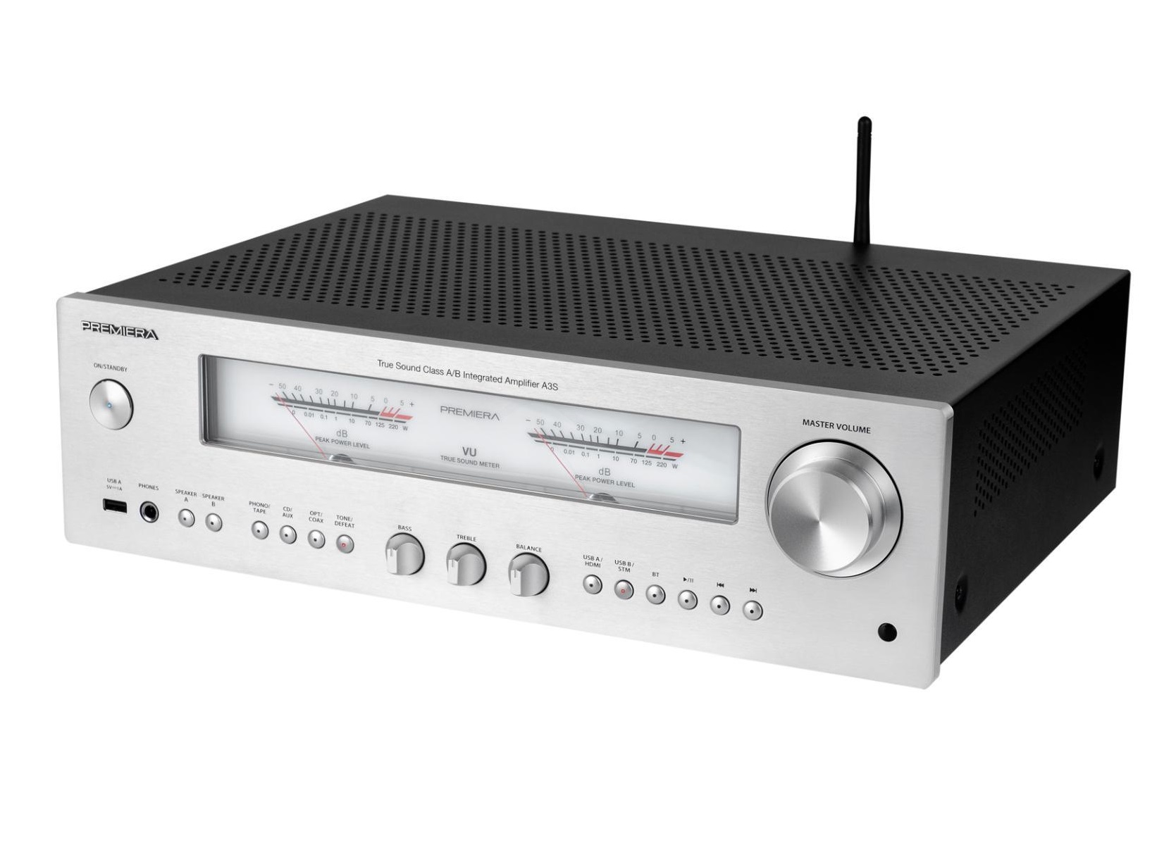 Premiera A3S - интегральный Hi-Fi стереоусилитель класса AB с номинальной выходной мощностью 110 Вт на канал, со встроенными сетевым проигрывателем, ЦАП, Bluetooth (aptX HD и AAC ), HDMI ARC, Wi-Fi, AirPlay 2 и MM/MC фонокорректором, USB-audio, тремя аналоговыми входами стерео линейного уровня (один из которых является балансным), а также оптическим и коаксиальными цифровыми входами. К Premiera A3S можно подключить две пары акустических систем.