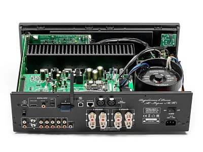 Интегральный усилитель. Выходная мощность - 85 Вт/канал при 8 Ом. Встроенный асинхронный USB ЦАП (24 бит, 96 кГц), фонокорректор ММ.