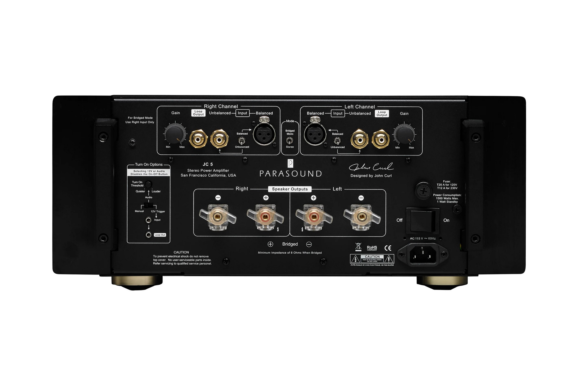 JC5 - стерео-усилитель мощности, основанный на конструкции флагманского моно-усилителя JC1. Постоянная мощность (RMS): 2 по 600 Вт (4 Ом), 2 по 400 Вт (8 Ом) или 1200 Вт (8 Ом) в мостовом режиме*.