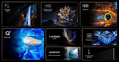 Телевизор с диагоналю 115" (2921 мм), экран 4К UHD по технологии QD-Mini LED. Более 20 000 зон локального затемнения обеспечивают управление светом на уровне элементов изображения, позволяют передать глубокую темноту и яркие детали реального изображения. Операционная система Google TV. Hi-Fi-система от ONKYO 6.2.2. Ультра тонкий дизайн корпуса. Настольная подставка поддерживает два уровня высоты, для удобного размещения переферийных устройств. Настенное крепление комбинирует подвесную петлю и магнитное притяжение.