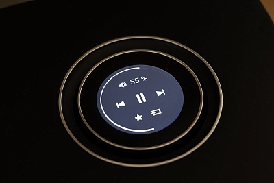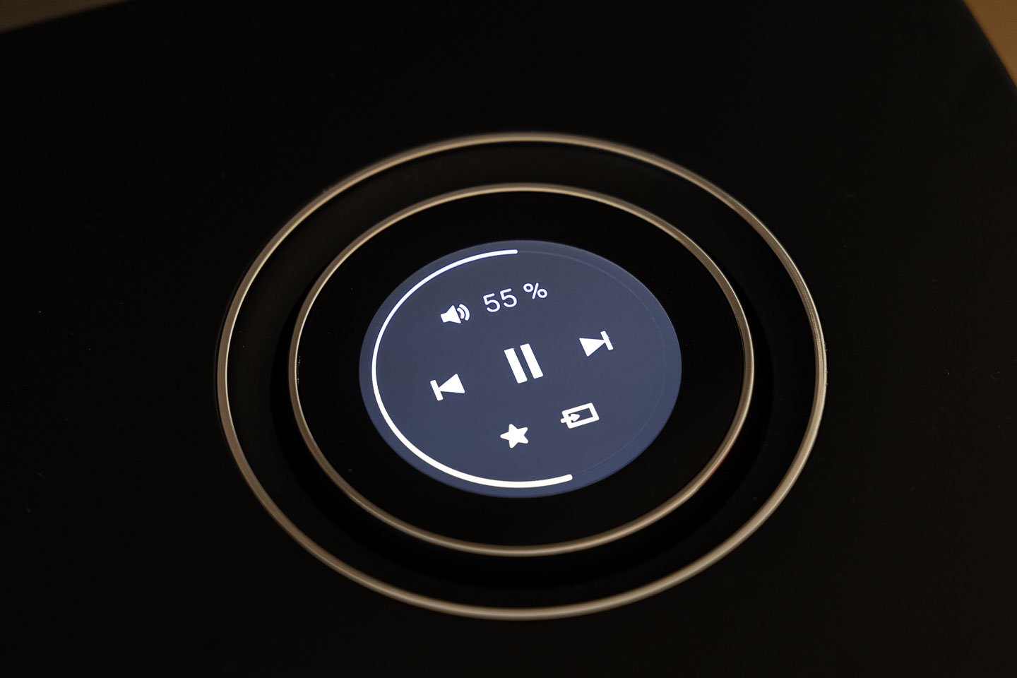 Сенсорное управление на верхней части колонки в виде вращающегося кольца с цветным дисплеем в центре. Очень удобное и позволяющее регулировать громкость с помощью вращающегося кольца, а на енсорном экране менять источники, добавлять или изменять любимые радио без необходимости заходить в приложение. На цветном экране также отображаются обложки воспроизводимых альбомов.