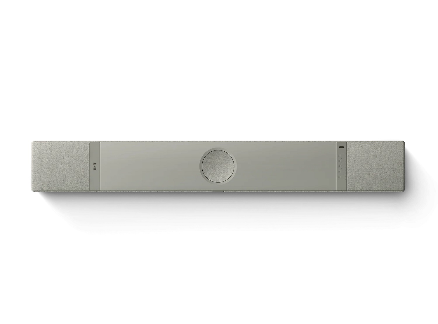 Звуковая панель KEF XIO имеет алюминиевую верхнюю пластину и тканевое покрытие. Она доступна в цветах Slate Black и Silver Grey, с возможностью установки на полку или стену.