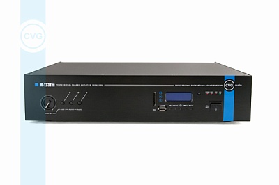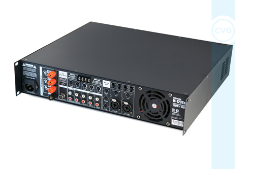 Усилитель имеет мощность 120W и может работать как в трансформаторном 100V (основной режим работы), так и низкоомном 4-16ohm. Усилитель одноканальный, подключаемые к нему стереофонические линейные сигналы от источников звука корректно суммируются и на акустические системы подается уже усиленный монофонический сигнал, более корректный для систем фонового звука и Public Address (обеспечивающий более равномерное звуковое поле). Помимо встроенного звукового модуля CVGaudio M-123Tm имеет три линейных входа выполненные на разъемах 2RCA с возможностью выбора активного с помощью селектора на лицевой панели.
