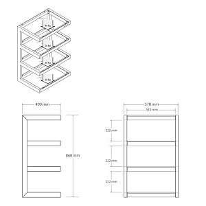 4 стеклянные полки, высота 86 см, ширина 57 см, макс. нагрузка на верхнюю пол...
