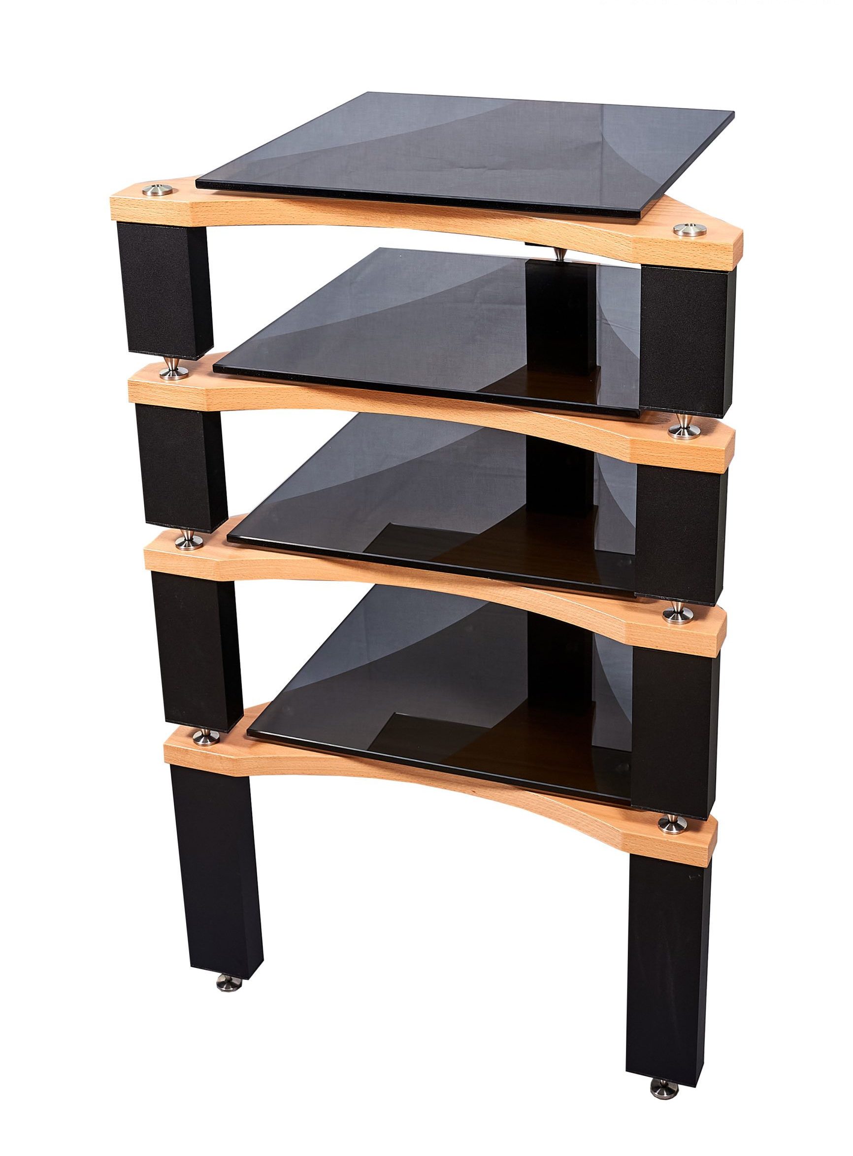 Стойка под Hi-Fi аппаратуру. Модульная конструкция. Каждая секция опирается на шипы, для устранения передачи вибраций. Черные полки из закалённого стекла толщиной 19 мм, серебристые алюминиевые стойки...