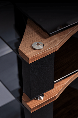 Стойка под Hi-Fi аппаратуру. Модульная конструкция. Каждая секция опирается на шипы, для устранения передачи вибраций. Полки из черного стекла толщиной 15 мм, черные стальные стойки. ...