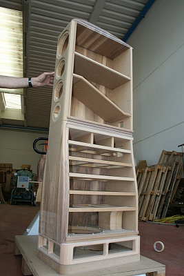 Сочетая панели из натуральной древесины с древесно-волокнистым композитом, скрепляемым в ортогональных плоскостях, мы объединяем наиболее полезные свойства обоих материалов. Фактически «эндоскелет» Serendipity решает задачу демпфирования механических вибраций, вызываемых низкочастотным громкоговорителем, и их удержания внутри корпуса. На фото показаны натяжные плоскости, порт фазоинвертора и кожух, содержащий два НЧ-громкоговорителя диаметром 320 мм в патентованной изобарической конфигурации NRS.