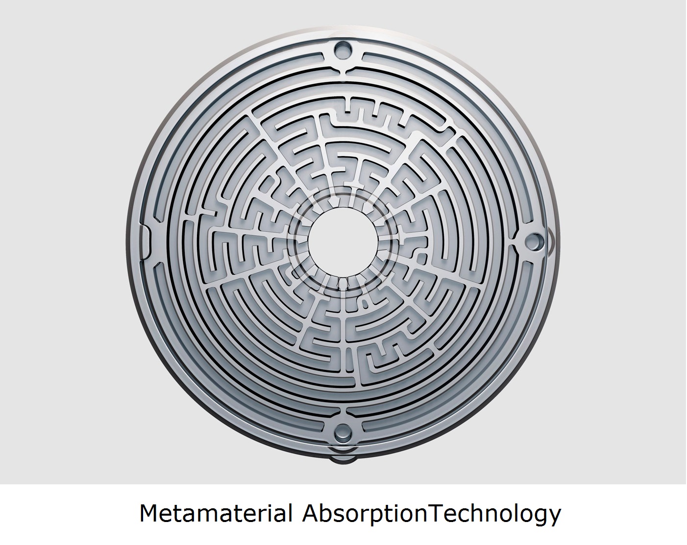 Это означает, что как можно больше звука с задней стороны купола направляется в абсорбер из метаматериала, а также снижает нелинейные искажения, вызванные изменениями давления воздуха сзади твитера.
