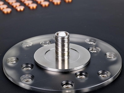 Главный подшипник выполнен из цельной нержавеющей стали с медной втулкой и керамический шарик подшипника и тефлоновая упорная пластина. Мы дополнительно модернизировали крышку подшипника с включением силиконовых демпфирующих колец между подшипником и алюминиевым диском. Подшипник стола установлен на 20-мм акриловом антивибрационном диске, изолирующем подшипник от цоколя, что еще больше снижает вибрацию и стоячие волны. Диск фиксируется на месте с помощью комбинации из нейлона PA-66 и винтов из нержавеющей стали для эффективного отсоединения подшипника и диска от шасси.