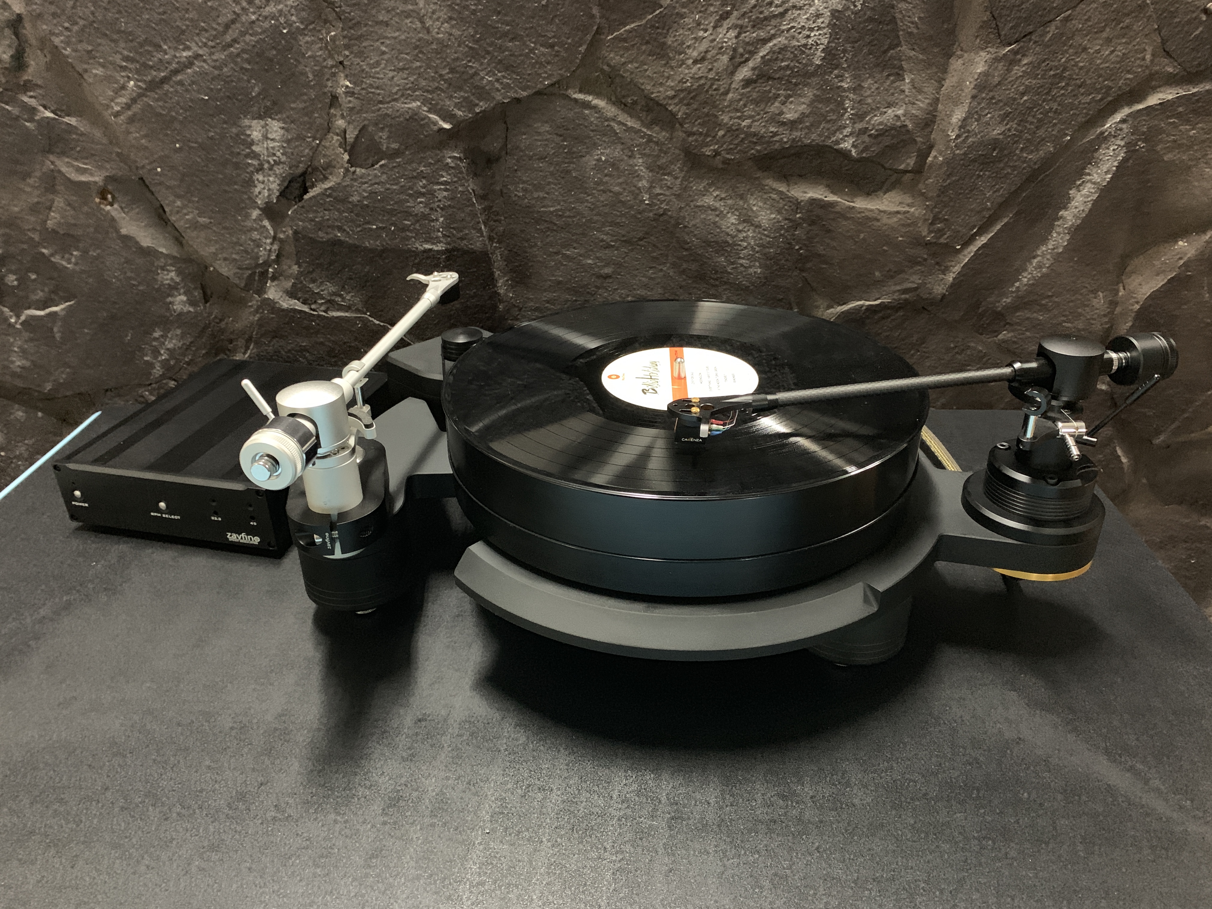 В стандартную комплектацию проигрывателя Zavfino ZV8 включен полностью независимый источник питания двигателя в алюминиевом корпусе весом 2 кг. Источник питания мотора имеет цепь регенерации переменного тока переменный - постоянный - переменный, что обеспечивает мотор переменным током с идеальной синусоидой. Переключение скоростей 33,3 и 45 об/мин. Тонкая регулировка выбранной скорости.