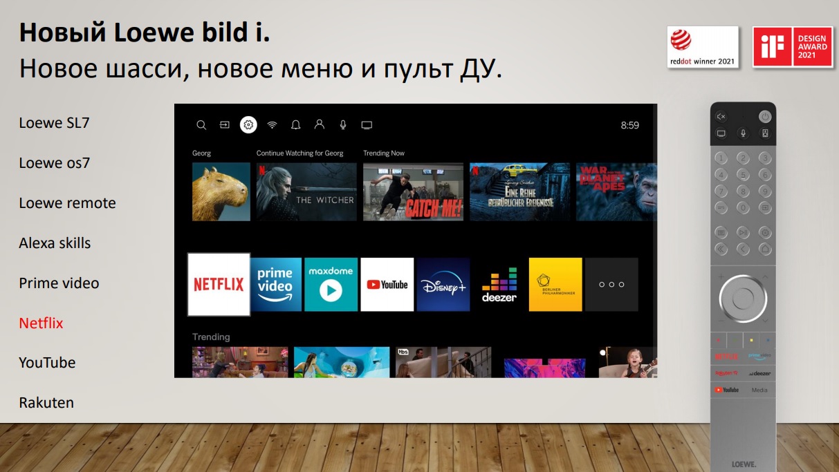Новая операционная система Loewe os7 обеспечивает исключительно быстрый доступ ко всем актуальным и встроенным потоковым сервисам, таким как Netflix и YouTube.