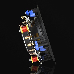 Встраиваемая стерео акустическая система. Монтажная глубина составляет всего 87 мм, а магнитные грили бескаркасной конструкции выступают на 3 мм от потолка и могут быть окрашены обычной потолочной краской в любой цвет. НЧ драйверы из плетёного стекловолокна на качественном резиновом подвесе для многолетней и стабильной работы, а также купольные стереофонические твитеры с титановым напылением.